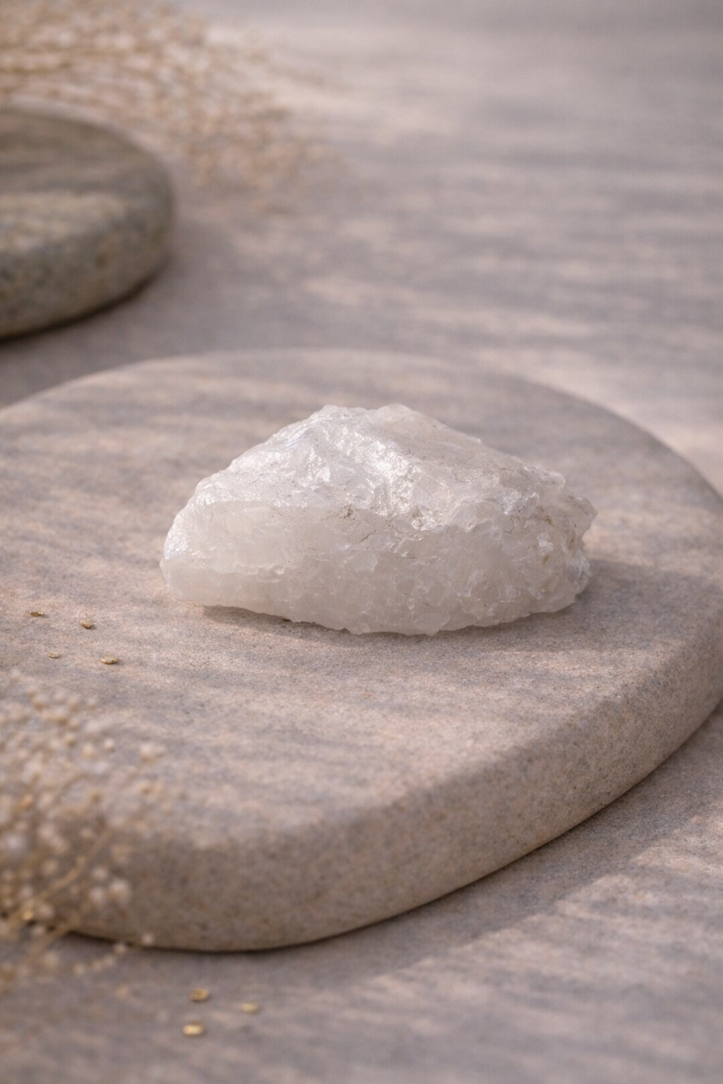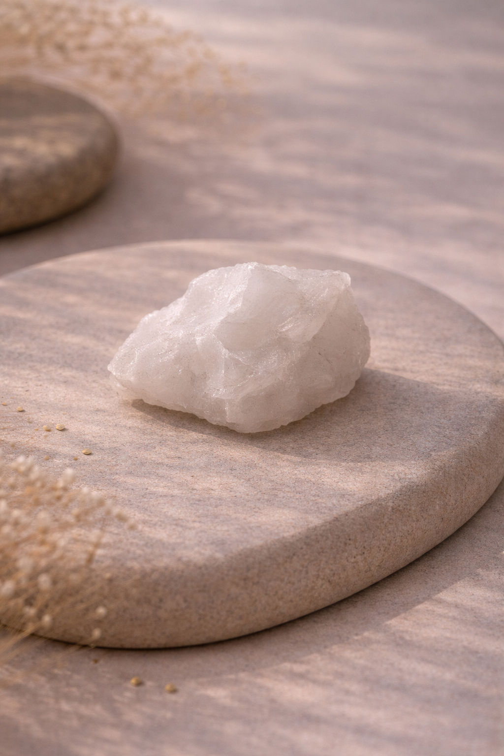 Seine klare bis leicht milchige Transparenz lässt das Licht sanft reflektieren und verleiht ihm eine ruhige, pure Präsenz.