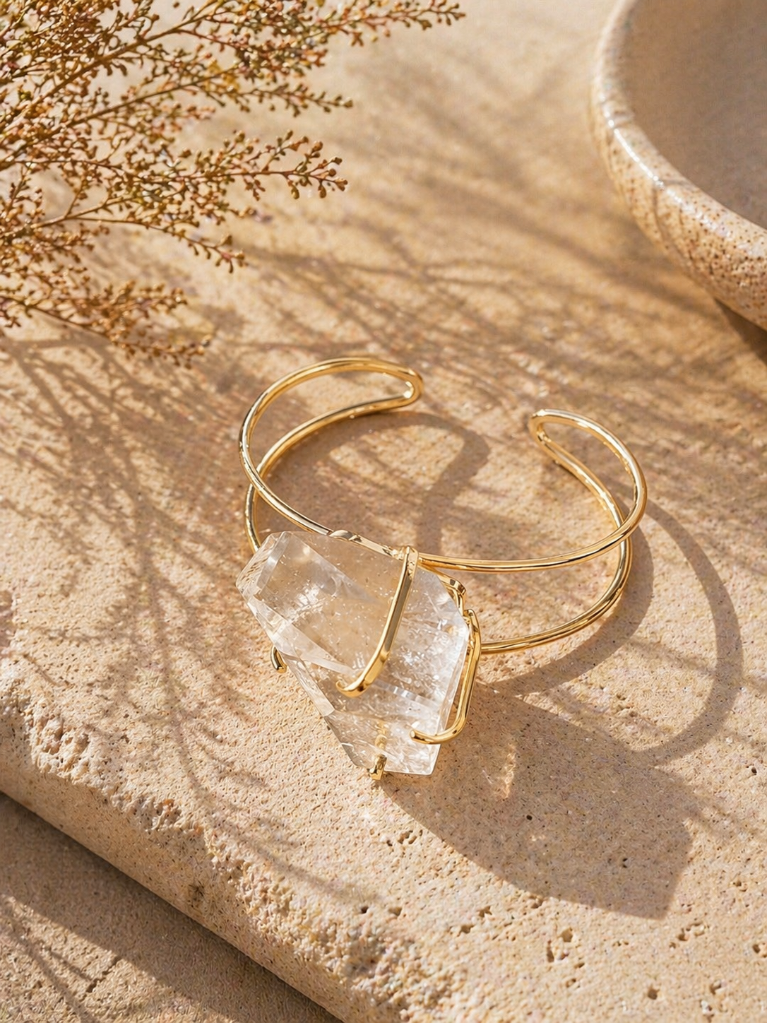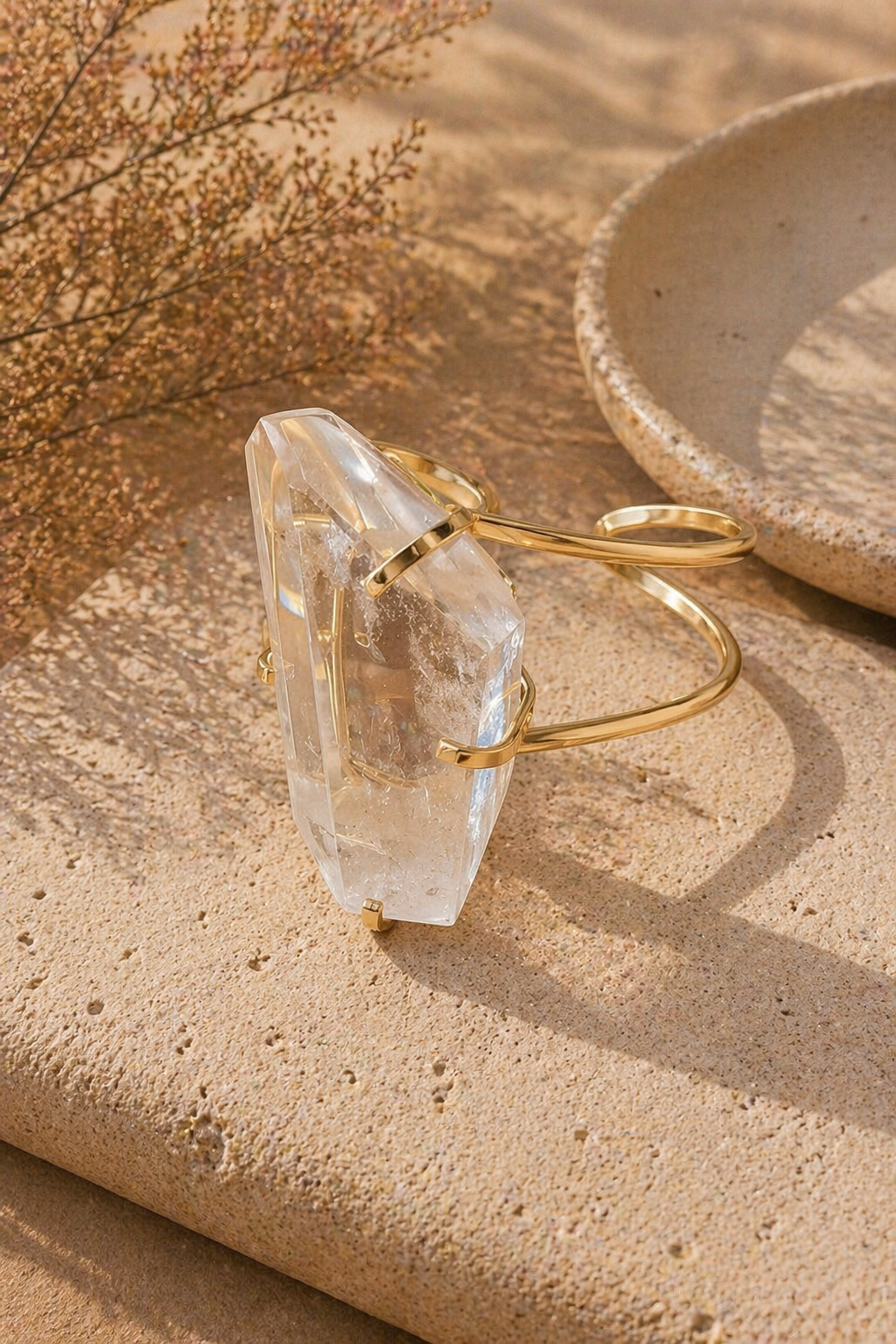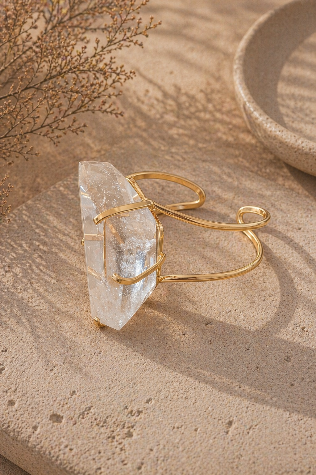 Der große Kristall trifft auf eine offene, klare Form. Ein bewusst gesetztes Statement zwischen Natürlichkeit und Eleganz.